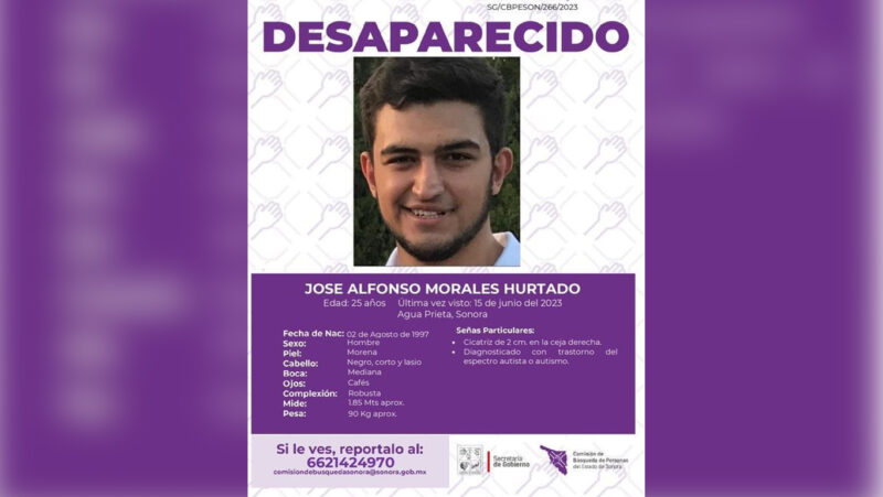 Con relación a la ficha de búsqueda del joven José Alfonso Morales Hurtado, de 25 años de edad, quien tiene capacidades diferentes que en ocasiones le han generado desorientación, y el cual se encuentra extraviado desde el pasado 15 de junio del 2023 en Agua Prieta, Sonora, se informa que la Fiscalía General de Justicia del Estado de Sonora (FGJES), en coordinación con diversas autoridades de los tres niveles de gobierno, mantiene desde el primer día en que se reportó su extravío, un operativo de búsqueda para dar con su paradero.