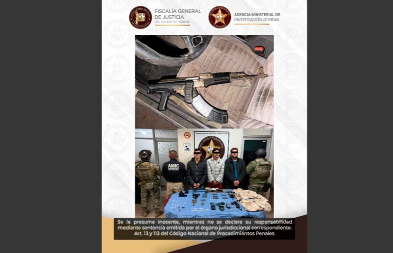 Derivado de estas diligencias ministeriales, se logró la detención de tres personas, así como el aseguramiento de diversos indicios, entre ellos armas, cargadores, equipo táctico, aparatos de comunicación y presunta droga, relacionados con actividades ilícitas.