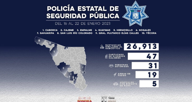 Durante el período del 16 al 22 de enero, la PESP realizó patrullajes de vigilancia y acciones de proximidad ciudadana en municipios de Sonora, generando resultados principalmente en Hermosillo, Cajeme, Guaymas, Empalme, Caborca, Sahuaripa, Nogales, Yécora, San Luis Rio Colorado y General Plutarco Elías Calles.