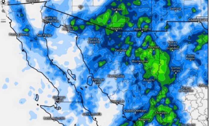 Para hoy, el frente frío (núm. 34) en combinación con una vaguada polar y las corrientes en chorro polar y subtropical originará cielos mayormente nublados con potencial de lluvias dispersas sobre regiones del norte, noreste, este, sur y parte del centro y noroeste; Guaymas con 60% de probabilidad de precipitaciones.