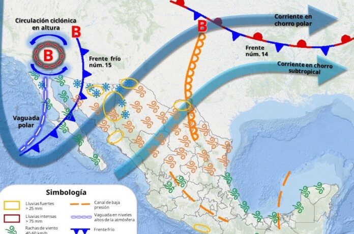 Hoy, el frente frío (núm. 15) se desplazará sobre Sonora y en interacción con una circulación ciclónica en niveles medios y altos de la atmósfera, además de las corrientes en chorro polar y subtropical, originarán descenso de temperatura y vientos fuertes en dicha región; así como chubascos y lluvias moderadas en el noroeste, norte, noreste, centro y oriente de Sonora. Por su parte, se mantiene la probabilidad de caída de nieve y/o aguanieve sobre la zona montañosa del norte.