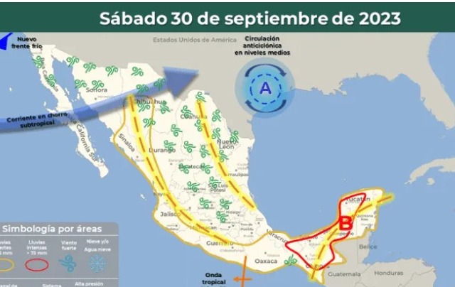 - Lluvias aisladas (0.1 a 5 mm): Baja California Sur, Zacatecas, San Luis Potosí, Hidalgo, Ciudad de México y Tlaxcala.