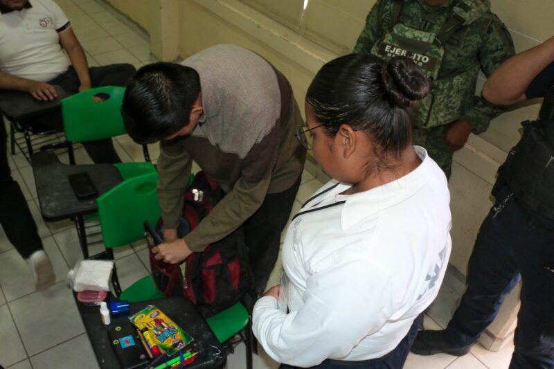 Inspeccionando alrededor de 200 mochilas, mismas que fueron revisadas por las y los estudiantes bajo la supervisión de personal de programas preventivos, cadetes y agentes de la corporación en compañía de trabajadores del plantel educativo, garantizaron un entorno seguro y tranquilo dentro de la institución.