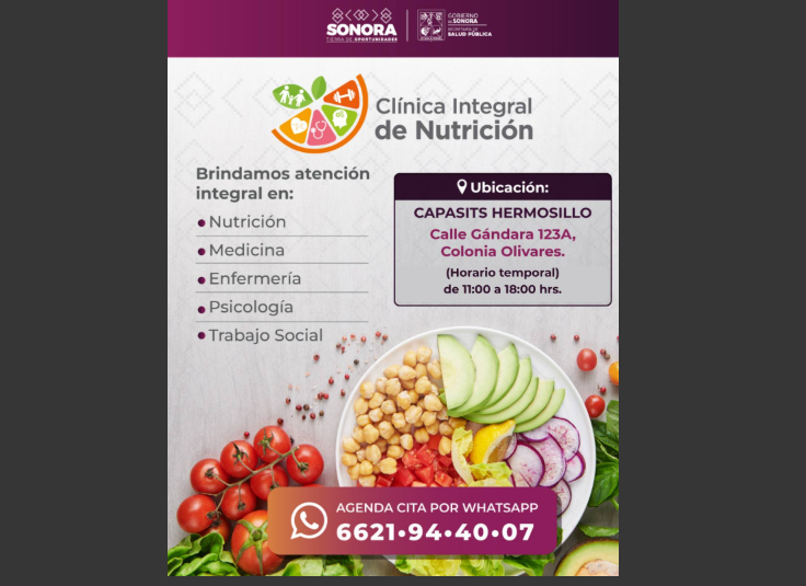 Las Clínicas Integrales de Nutrición operan en Hermosillo, Ciudad Obregón, Nogales, Caborca y Cananea, y están disponibles para todas las personas interesadas en recibir orientación profesional para el control de peso y la prevención de enfermedades asociadas, sin importar su edad o derechohabiencia.