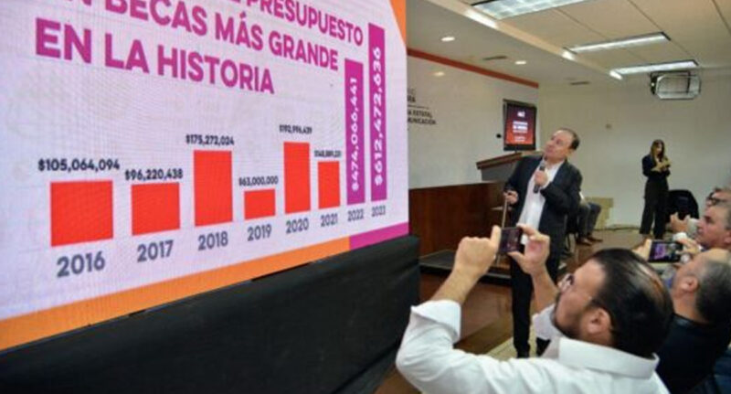 El gobernador Durazo Montaño afirmó que la transformación de Sonora solo es posible hacerlo desde las aulas, por ello se han impulsado programas entre ellos, el más importante que es el programa de becas; en 2022 con 475 millones de pesos, se apoyó a 87 mil 600 estudiantes sonorenses; en 2023 se apoyó a 110 mil con 612 millones de pesos; y para el 2024 ya fue aprobado por el Congreso del Estado 740 millones de pesos y se beneficiarán 150 mil estudiantes.