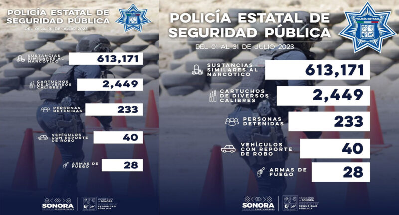 Durante el mes, los agentes de la PESP trabajaron en apoyo a la seguridad de la ciudadanía en municipios de Sonora, registrando el aseguramiento de 233 personas, además de la recuperación de 40 vehículos con reporte de robo y lo equivalente a más de 613 mil dosis de sustancias similares al narcótico, con valor a $30,837,540 evitando que la delincuencia se beneficiarán al distribuirlas al narcomenudeo.