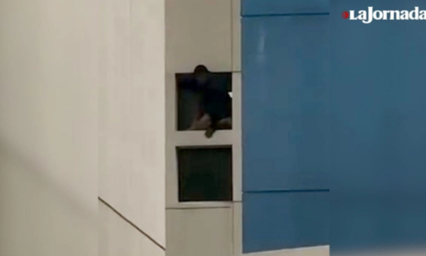 El individuo, vestido con una playera negra y sin pantalones, se encontraba en la parte exterior del marco de una de las ventanas, lo que provocó una intensa movilización de elementos de corporaciones de seguridad.