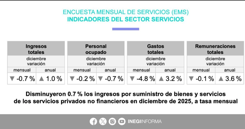 Ciudad de México. Los ingresos de los establecimientos de servicios concluyeron 2025 con una reducción de 0.7 por ciento frente a noviembre, informó este viernes el Instituto Nacional de Estadística y Geografía (Inegi).