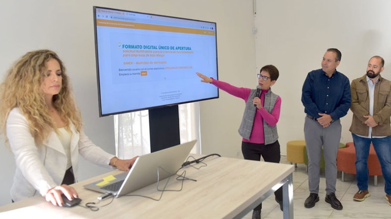 El Presidente Municipal de Hermosillo, acompañado de Gertie Agraz Boeneker, directora de la Agencia Municipal de Desarrollo Económico (AMDE) y Alejandro López Parada, director de Inspección y Vigilancia del Ayuntamiento, presentó este modelo completamente digital para tramitar licencias de funcionamiento a negocios de 252 giros de bajo riesgo.