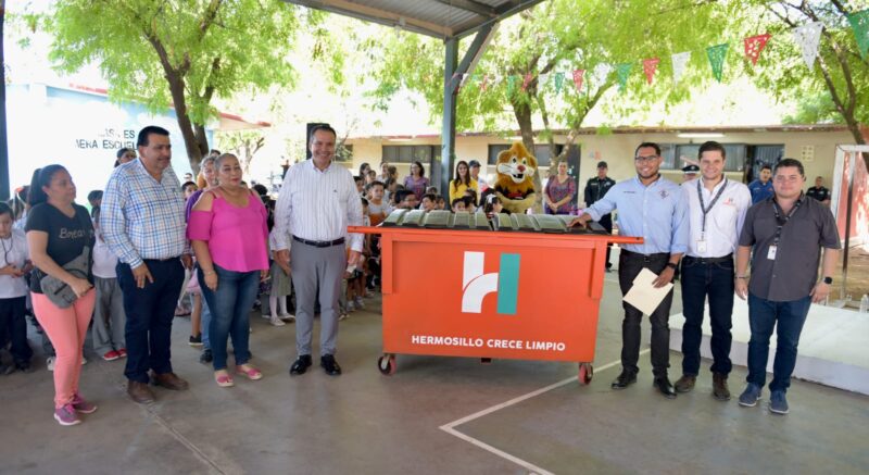 Después de acompañar a las y los integrantes de la comunidad educativa y de servicios en la ceremonia de Lunes Cívico, Toño Astiazarán entregó contenedores de basura, uno de los cuales se destinará a materiales reciclables como plástico, aluminio y cartón, y anunció pláticas a las y los estudiantes sobre importancia de reciclar y cuidar el medio ambiente