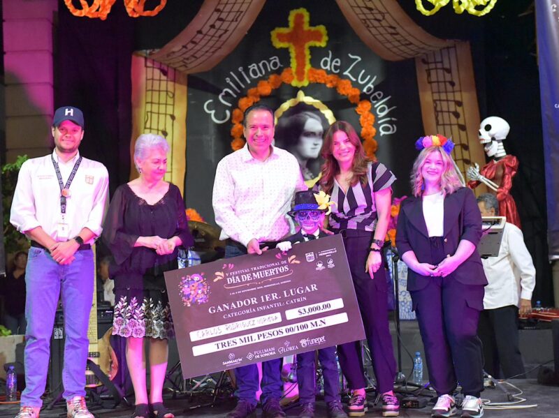 Luego de un recorrido en la Plaza Zaragoza para visitar los altares instalados alrededor del kiosko, tanto el Presidente Municipal como la Presidenta de DIF Hermosillo encabezaron la premiación de catrines, catrines y el catridog participantes en la marcha que regresó después de años de ausencia.