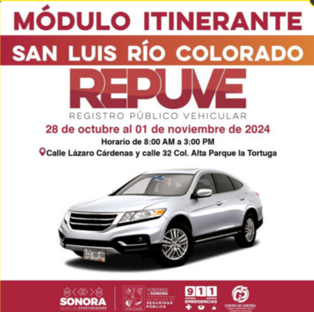 En atención a los habitantes de San Luis Río Colorado interesados en la regularización de autos usados de procedencia extranjera, el Gobierno de Sonora instaló en el municipio el módulo itinerante del Registro Público Vehicular (Repuve) dependiente de la Secretaría de Seguridad Pública (SSP).