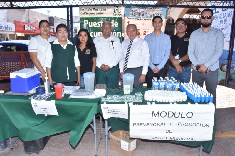 Enfermeras del IMSS y personal de Salud atendieron desde el comienzo de la jornada a los transeúntes, proporcionándoles sobres de suero Vida Oral, dosis de albendazol como desparasitante, plata coloidal para desinfección de agua, frutas y verduras, y folletos ilustrativos.