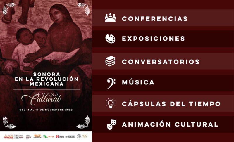 Hermosillo, Sonora; 7 de noviembre de 2023.- Del 11 al 17 de noviembre se realizará la segunda edición de la Semana Cultura “Sonora en la Revolución Mexicana”, organizada por la Secretaría de Educación y Cultura (SEC) con el objetivo de rememorar este momento histórico y trascendental para el país.