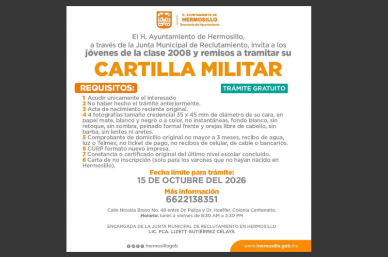 Hermosillo, Sonora.- El personal de la dirección de Servicios de Gobierno de la Secretaría del Ayuntamiento de Hermosillo ya está listo para atender a los jóvenes clase 2008 y remisos para asistirlos en el trámite por primera vez de su cartilla del Servicio Militar Nacional, conforme a la convocatoria 2026, informó Eduardo Acuña Padilla.