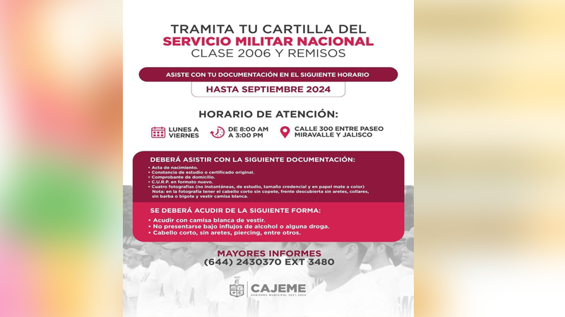 La Junta Municipal de Reclutamiento de Cajeme invita a las y los jóvenes de la clase 2006, remisos y mujeres voluntarias, a realizar el trámite para obtener su Cartilla del Servicio Militar Nacional, un documento oficial que les abrirá puertas en el ámbito laboral, académico y social.