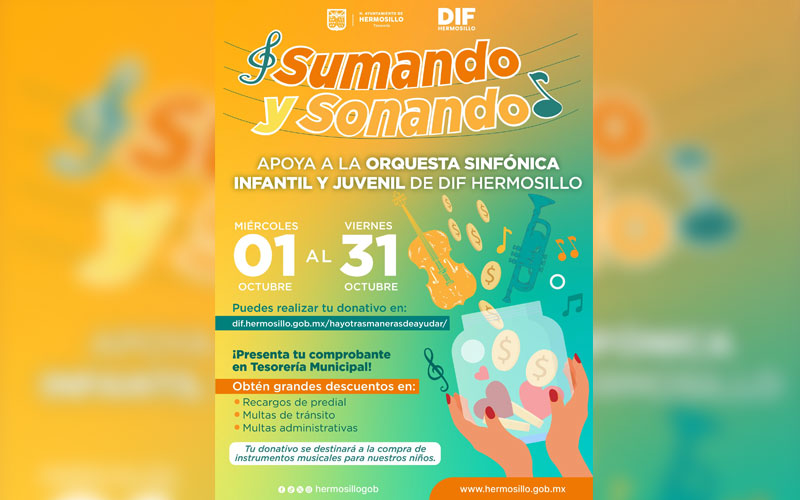 Hermosillo, Sonora; 22 de octubre de 2025.-Quedan pocos días para que las y los hermosillenses se sumen al reto “Sumando y Sonando”, una iniciativa de Tesorería Municipal y DIF Hermosillo que combina el talento musical con la solidaridad, para dotar de nuevos instrumentos a la Orquesta Sinfónica Infantil y Juvenil.