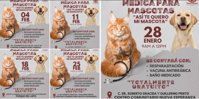 Puerto Peñasco, Sonora.- La Coordinación Municipal de Salud, bajo la dirección del Dr. Arturo Cota Moreno, en colaboración con la Coordinación de Control Animal, encabezada por el Veterinario Erick Gastélum, invita a toda la población de Puerto Peñasco a participar en la Jornada Médica para Mascotas de este 2025.