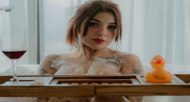 La influencer muestra que se está relajando con una copa de vino y un pequeño patito de hule para que nade entre el agua mientras ella se baña.