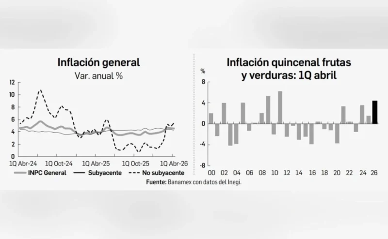 “Pese a la ligera moderación de la inflación general y las menores presiones del componente subyacente, el balance de riesgos para la inflación se mantiene sesgado al alza. Ante la rigidez que ha mostrado la subyacente, es poco probable que en las siguientes lecturas repita el comportamiento de esta quincena, por lo que se mantendría por encima de 4 por ciento anual. En el caso del componente no subyacente, destacan nuevas presiones en el rubro de agropecuarios, particularmente frutas y verduras (23.03 por ciento), lo que complica la convergencia del indicador general hacia la meta de 3 por ciento”, explicó Kevin Castro, analista económico de Monex.