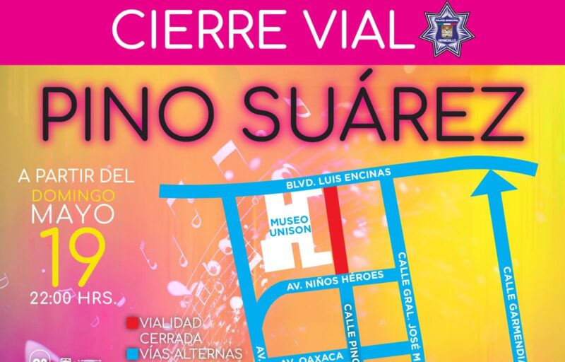 El vocero del Departamento de Tránsito Municipal César Ovier Quintero Pérez, detalló que la noche del domingo se cerrará la circulación en la avenida Pino Suárez y bulevar Encinas, ante la instalación de un escenario.