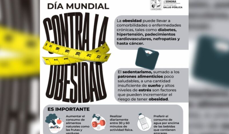 En el Día Mundial Contra la Obesidad, la Secretaría de Salud (SSA), hizo un llamado a las y los sonorenses a llevar una vida saludable para evitar este padecimiento, el cual puede agravarse y hacer que se desarrollen enfermedades crónicas.