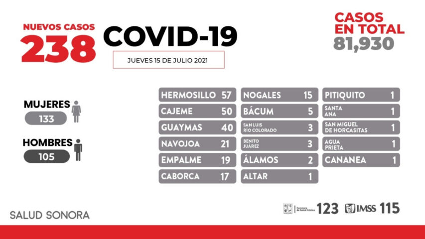 Se suman 238 nuevos casos por Covid en 133 mujeres y 105 hombres; acumulándose 81 mil 930 casos en total desde el inicio de la pandemia. Los nuevos casos son residentes de Hermosillo 57; Cajeme 50; Guaymas 40; Navojoa 21; Empalme 19; Caborca 17; Nogales 15, Bácum 5; San Luis Río Colorado y Benito Juárez 3 cada uno; Álamos dos; Altar, Pitiquito, Santa Ana, San Miguel de Horcasitas, Agua Prieta y Cananea uno cada uno.