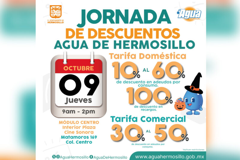 Agua de Hermosillo convoca a sus usuarios a participar en la Jornada de Descuentos que se llevará a cabo el jueves 09 de octubre, en el Módulo Centro Interior Plaza Cine Sonora, en un horario de 9:00 a.m. a 2:00 p.m.