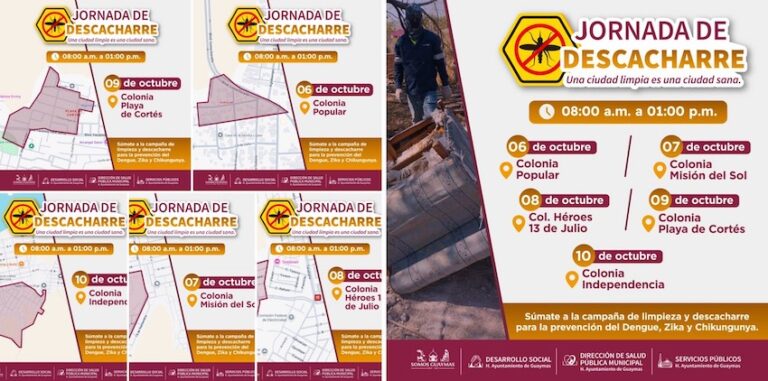 Guaymas, Sonora.- Del 6 al 10 de octubre el Ayuntamiento de Guaymas prepara la Jornada de descacharre para trabajar en la prevención de dengue, zika y chikungunya, por ello, invitan a las familias a participar en la limpieza de patios.