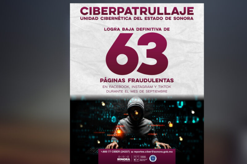 El Gobierno de Sonora logró la baja definitiva de un total de 63 páginas fraudulentas mediante labores de ciberpatrullaje en las principales plataformas de redes sociales Facebook, Instagram, TikTok y páginas de internet, durante septiembre del presente año.
