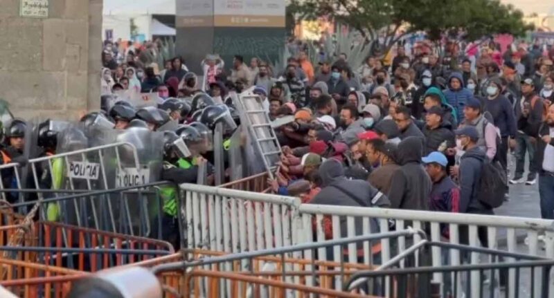 Desde las primeras horas de este martes, aproximadamente a las 06:30 horas, se informó sobre un grupo de trabajadores provenientes de Oaxaca, Chiapas y Guerrero que intentó entrar al Palacio de forma violenta, por lo cual policías con escudos bloquearon el acceso y protagonizaron una riña.