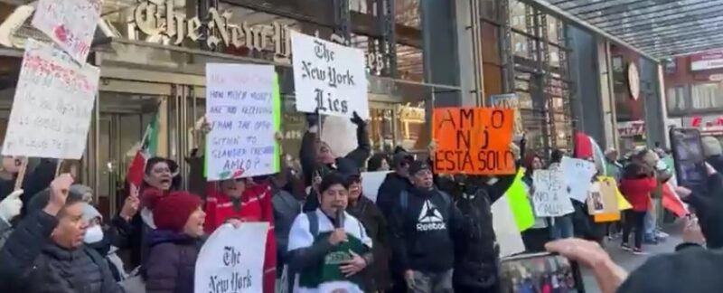 Ciudad de México. Decenas de migrantes mexicanos se dieron cita este domingo en la sede del diario New York Times para expresar su respaldo al presidente de México, Andrés Manuel López Obrador, y exigir “respeto” al diario estadunidense, esto luego de que el medio diera a conocer un reportaje sobre presuntos vínculos del mandatario con el narcotráfico.