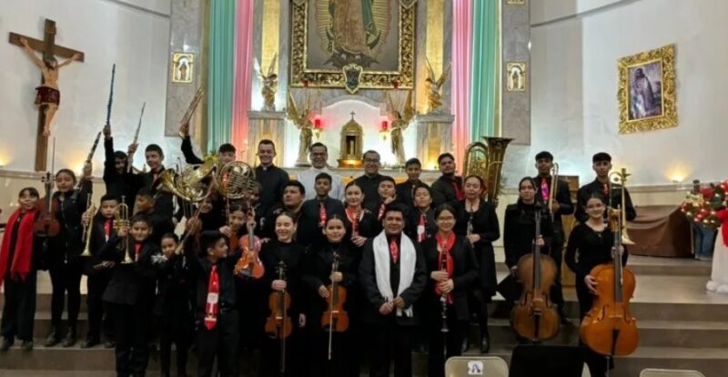 Mientras se preparaban a ingresar al Cereso femenil de Nogales para participar en un evento dedicado a las internas del mencionado penal, el padre Edgardo, párroco de la capilla San José Sánchez Del Río, ubicada en el fraccionamiento La Mesa, manifestó que la orquesta está compuesta por más de 30 niños y jóvenes de la comunidad.