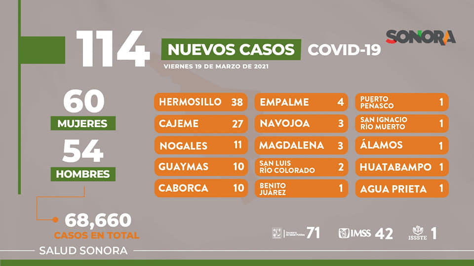 Este día se suman 114 nuevos casos por Covid, en 60 mujeres y 54 hombres, acumulándose 68 mil 660 casos en total desde el inicio de la pandemia. Los nuevos pacientes son residentes de: Hermosillo 38; Cajeme 27; Nogales 11; Guaymas y Caborca 10 cada uno; Empalme 4; Navojoa y Magdalena 3 cada uno; San Luis Río Colorado 2; Benito Juárez, Puerto Peñasco, San Ignacio Río Muerto, Álamos, Huatabampo y Agua Prieta 1 cada uno.
