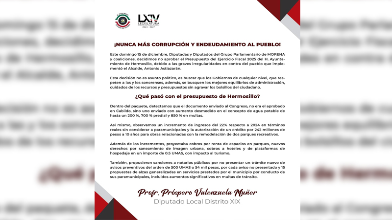 Este domingo 15 de diciembre, Diputadas y Diputados del Grupo Parlamentario de MORENA y coaliciones, decidimos no aprobar el Presupuesto del Ejercicio Fiscal 2025 del H. Ayuntamiento de Hermosillo, debido a las graves irregularidades en contra del pueblo que implementó el Alcalde, Antonio Astiazarán.