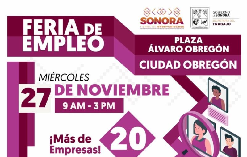 Serán más de 2 mil vacantes en distintas áreas laborales las que se ofertarán en colaboración con empresas locales. En Ciudad Obregón será el 27 de noviembre y en Navojoa el 28, ambas ferias en un horario de 9:00 a 15:00 horas.