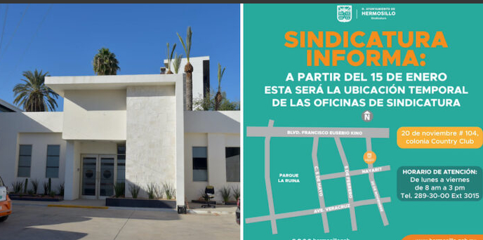Sindicatura Municipal informa que proporcionará sus servicios de manera temporal en oficinas ubicadas en la calle 20 de noviembre 104, entre bulevar Kino y Nayarit, colonia Country Club, de lunes a viernes en horario de oficina de 8:00 a 15:00 horas.