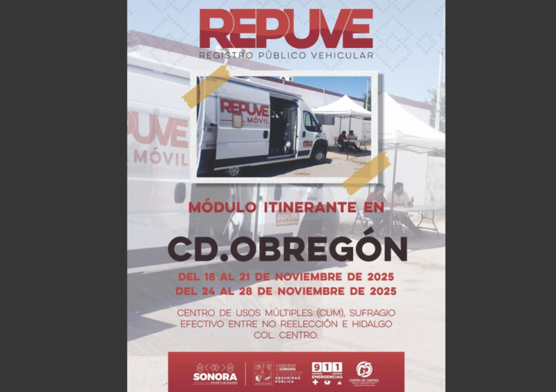 Ciudad Obregón, Sonora; 14 de noviembre de 2025.- En apoyo a las y los habitantes de Ciudad Obregón interesados en realizar el trámite de regularización de autos usados de procedencia extranjera, se instalará el módulo itinerante del Registro Público Vehicular (Repuve) durante dos semanas, informó la Secretaría de Seguridad Pública (SSP) en Sonora.