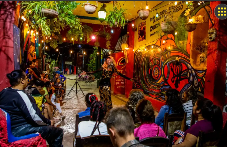 Poco después, metros adelante, dos chicas trans afrocubanas, comienzan a escenificar un show para su comunidad. Una lleva un escotado vestido gris y su pelo teñido de rubio. La otra, un traje negro con adornos dorados, y el cabello rojo corto. El espectáculo no es para el turismo. En el callejón, hay apenas dos o tres extranjeros.