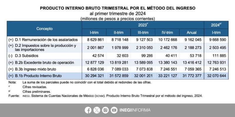 De acuerdo con el informe: PIB método del ingreso y del gasto del primer trimestre de 2024, el PIB de la economía fue de 32 billones 70 mil 699 millones de pesos corrientes y un incremento de 5.9 por ciento a tasa anual, muy por debajo de los 33 billones del trimestre previo y de 8 por ciento de incremento anual.