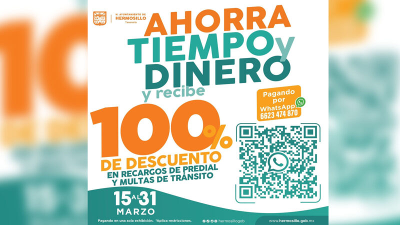 En marzo, puntualizó, está vigente el descuento del 5 por ciento por pronto pago del predial a quienes están al corriente y las personas con adeudos anteriores a este año por predial, multas de Tránsito y administrativas pueden liquidarlos con quita de recargos, si lo hacen a través de WhatsApp, del 15 al 31 de marzo de 2023.