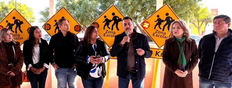 Durante el arranque de este programa, el Presidente Municipal hizo la entrega simbólica de los primeros cinco señalamientos verticales de reducción de velocidad en zonas escolares, en beneficio de la comunidad académica de cinco instituciones educativas, entre ellas la escuela Luis Encinas, Carlos M. Calleja, Jesús Aguirre, Amado Nervo y Adolfo López Mateos.