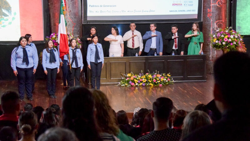 La ceremonia a la que Elías Retes asistió como invitado especial se desarrolló en el Auditorio Municipal, fungiendo como anfitriona la directora Cira María Pérez Flores, acompañada del rector del Centro Regional de Formación Profesional Docente de Sonora (CRESON), Luis Flores Fontes.