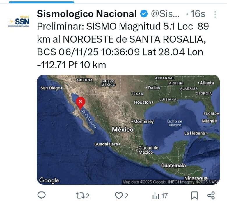 Preliminar: SISMO Magnitud 5.1 Loc 89 km al NOROESTE de SANTA ROSALIA, BCS 06/11/25 10:36:09 Lat 28.04 Lon -112.71 Pf 10 km