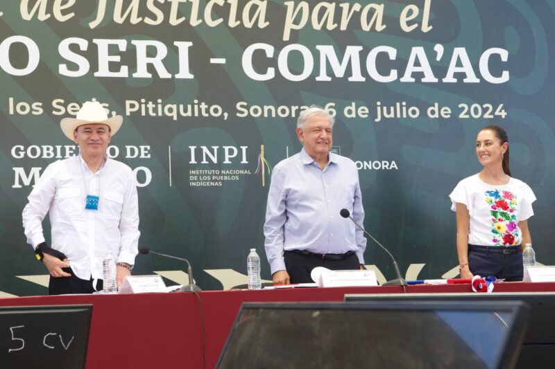 El mandatario sonorense destacó que es la cuarta visita del presidente López Obrador a Territorio Seri y agradeció a la presidenta electa Sheinbaum haber asumido desde su etapa como candidata, el compromiso con dar continuidad a los planes de justicia para la etnia Seri.
