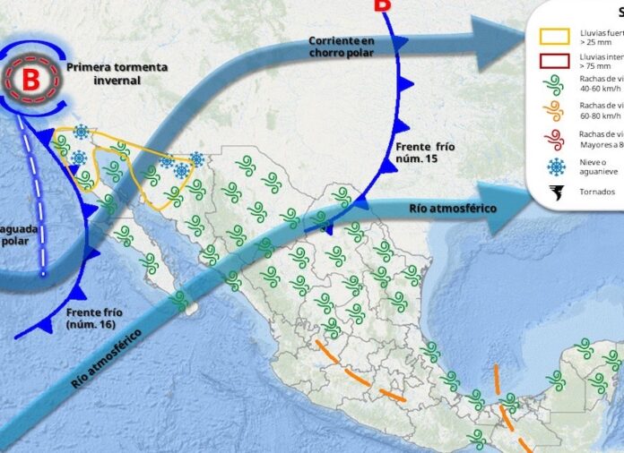 Hoy, el frente frío (núm. 16) recorrerá gradualmente Sonora y continuará asociado con una vaguada polar, además de las corrientes en chorro polar y subtropical, originarán la primera tormenta invernal de la temporada generando un descenso de temperatura con un ambiente de frío a muy frío y vientos fuertes y lluvias moderadas en la región noroeste, norte y noreste de Sonora; asimismo, se mantiene la probabilidad de caída de nieve y/o aguanieve sobre la zona montañosa del norte durante la mañana del sábado.