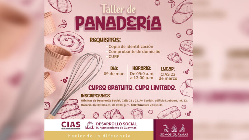 A partir de este 9 de marzo, el Ayuntamiento de Guaymas a través de Desarrollo Social iniciará el “Taller de Panadería”, en el Centro Integral de Atención Social (CIAS) de la colonia 23 de marzo.