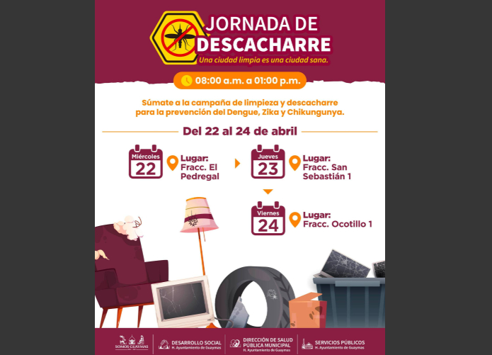 Esta actividad con la que se busca prevenir casos de dengue, zika y chikungunya, iniciando este 22 de abril en sector Pedregal, el día 23 de abril en San Sebastián I y el viernes 24 en Ocotillo I, esto en horario de 8:00 a.m. a 13:00 p.m. y se contará con la colaboración de Desarrollo Social y Servicios Públicos.