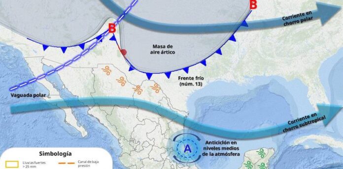 Durante la noche de hoy y primeras horas del domingo, se prevé el ingreso de un nuevo frente frío (núm. 13) sobre el norte del país. Este sistema, mantendrá un ambiente de muy frio a fresco sobre municipios de la región montañosa del estado de Sonora con valores que oscilen entre los 0°C a los 9°C al amanecer. Asimismo, un ambiente cálido a caluroso durante la tarde con temperaturas entre los 35°C a los 40°C.