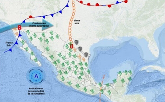 Además, habrá fuertes rachas de viento sobre el noreste y este (Sierra Madre Occidental), con velocidades que superen los 60 km/h y posibles tolvaneras.